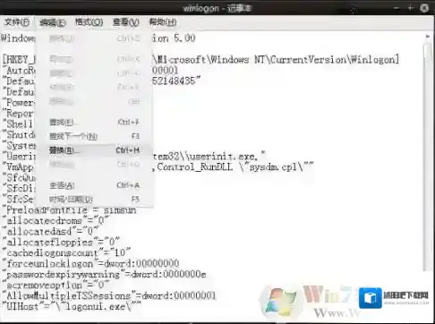 7、现在我们来讨论下如何进行备份或者已导出注册表信息的导入,正如本人情况winlogon项目下子项颇多,不可能照着注册表信息逐条输入,而直接导入的话项目名称又不对(之前已经把项目名称改为“111”了)因此可以如下操作,以SOFTWARE为例,假如之前选择了SOFTWARE 作为加载的配置单元并将其项目名称定为111,可以用记事本打开已经备份或者导出的注册表信息文件,点击任务栏里的编辑选择替换