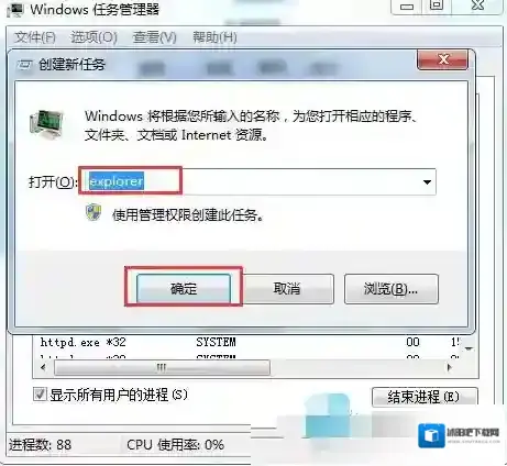 3、结束后,再点击“文件”–“新建任务(运行)”–输入“explorer.exe”回车;