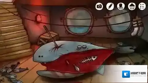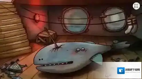 研究员拿起一段飞鱼仔细端详。这也没什么不同啊,奇怪,他嘴里还嘟囔着,不过,比起飞鱼,也许船舱里那巨大的尸骸。欲言又止的他却不明白,这短短几句话给了你无限的启发,你决定拿起他的刀,会船舱看看(点击桌面的刀,带走)。不过在这之前,你并没有忘记,拿出之前得到的胶带,把左下方那因为线路破损而坏掉的机器修好(点击胶带,点击破损的电线使用)