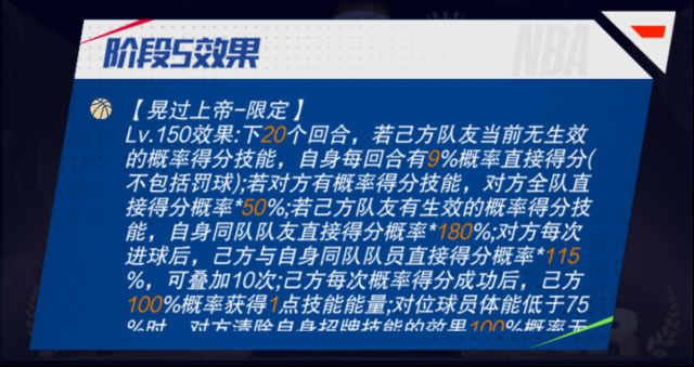 晃过上帝:下X个回合,若己方队友当前无生效的概率得分技能,自身每回合有X%概率直接得分(不包括罚球);若对方有概率得分技能,对方全队直接得分概率*X%;若己方队友有生效的概率得分技能,自身同队队友直接得分概率*X%;对方每次进球后,己方与自身同队队员直接得分概率*X%,可叠加Y次;己方每次概率得分成功后,己方X%概率获得Y点技能能量;对位球员体能低于X%时,对方清除自身招牌技能的效果X%概率无效。(预计在上线同时开启迈向巅峰)