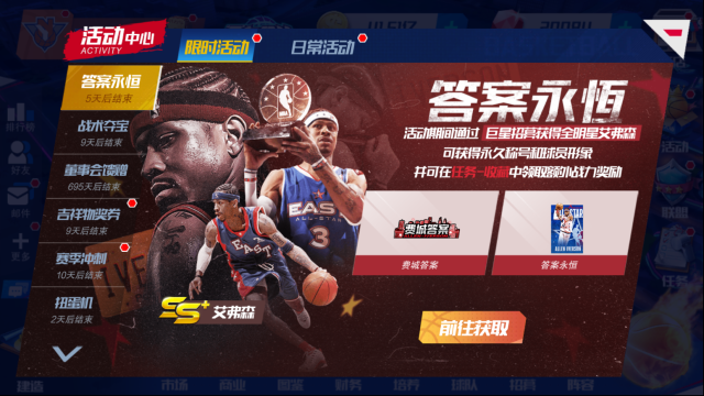 活动期间通过巨星招募获得全明星限定SS+艾弗森,可领取。限定称号“费城答案”+艾弗森专属形象。