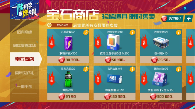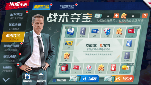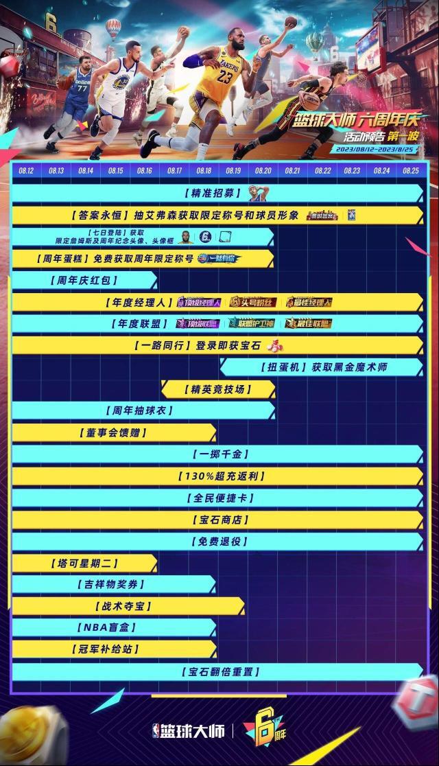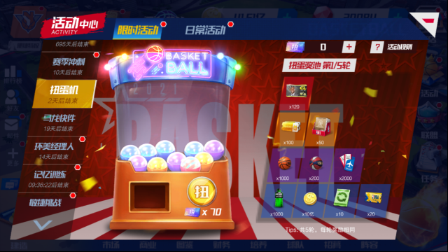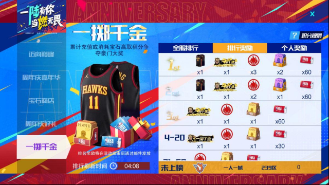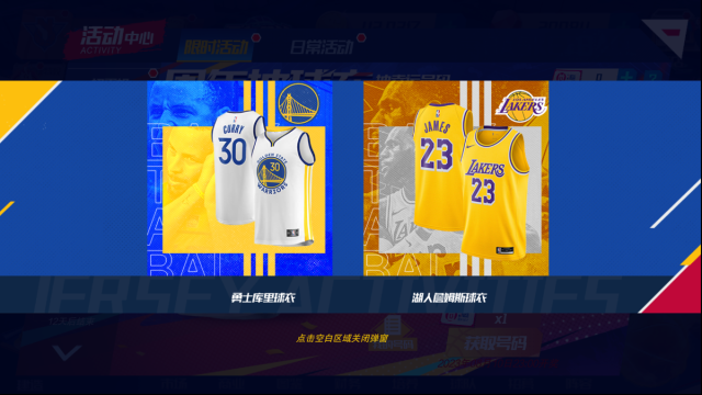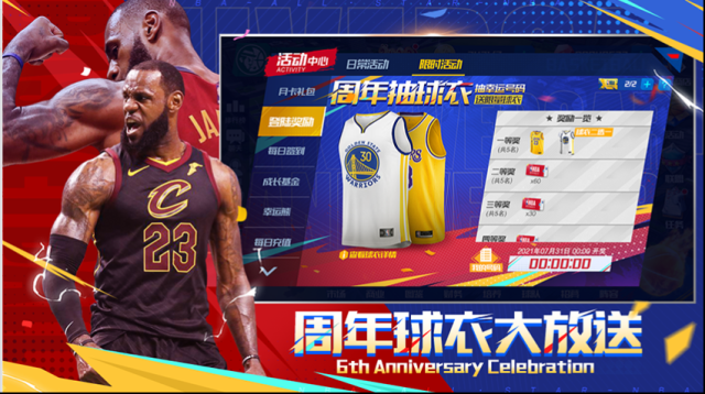 在礼包商在礼包商城内购买特定礼包,将额外附赠一定数量的“周年球衣券”,使用一张“周年球衣券”,可在活动界面抽取一张随机号码。抽奖时间截止时,系统将统一在已发放的号码中进行抽奖,一等奖可获得勇士队库里球衣、湖人队詹姆斯球衣二选一