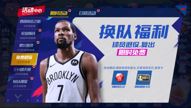 免费退役和复出开启,活动期间,退役和复出无需宝石和退役卡,换队无压力。