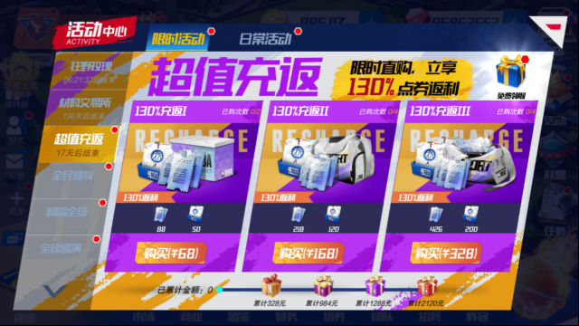 大师技巧心得限时直购,立享130%点券返利,累计购买礼包达到一定次数,还可获得“一键特训卡”、“迈向巅峰直通卡”等奖励!