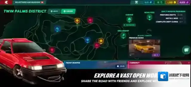 3、点击左上角可以打开游戏地图,在地图上你可以看到不同的比赛地点和汽车商店。