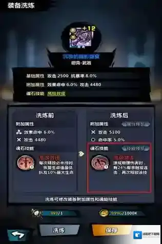 3、如果对获取的装备技能不满意,可以使用洗练功能对装备技能进行重置,重置范围固定在装备原来给出6个初始技能之间随机选择,洗练需要消耗洗练石与金币
