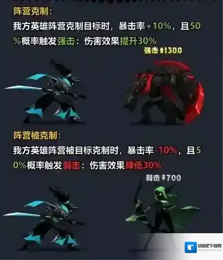 当我方英雄阵营克制目标时,将会提高暴击、触发强击以及提升伤害,反之,若被克制时,将会减少暴击、触发弱击以及降低伤害。