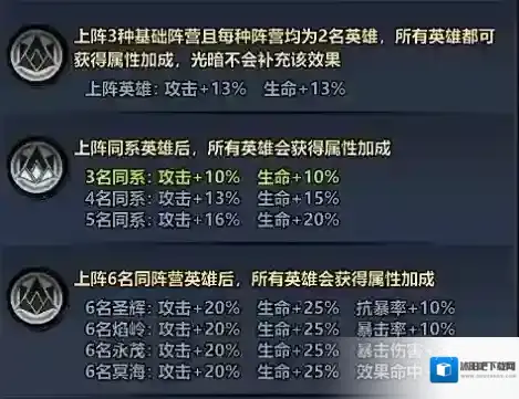 当上阵的英雄为同系英雄时,相同羁绊英雄之间将会获得额外属性加成效果。随着同系英雄的上阵人数增加,相关英雄所获得的羁绊属性加成也会随着提升。