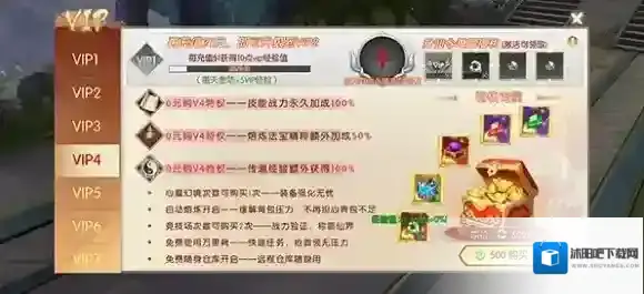 无论是什么类型的游戏,VIP都是一个至关重要的东西。这在这里,VIP4能提供100%的传道经验加成,同时游戏中的副本次数也会增加。而这样的特权在游戏前期就会产生出很大的优势,从而在前期就能拉开很大的差距了