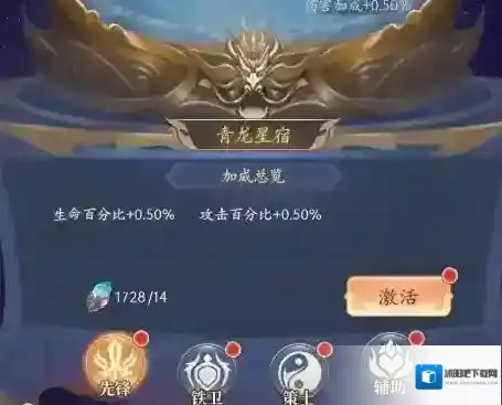 1、青龙、白虎、朱雀、玄武四个星宿台分别对应先锋铁卫、策士、辅助4个职业,星宿台激活后,可为对应职业的武将带来属性加成。