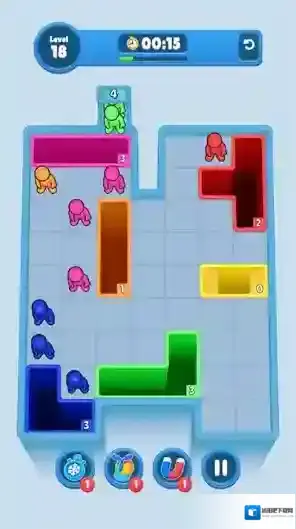 游戏的玩法比较简单,通过移动关卡里的方块让对应颜色的小人进入洞口就可以通关。在关卡里只有对应颜色的小人才可以进入洞口,而且不同颜色的方块和小人是无法穿过去的,移动各种颜色的方块来寻找合适的途径,将所有的小人全部送入洞口来体验最有趣的闯关过程。