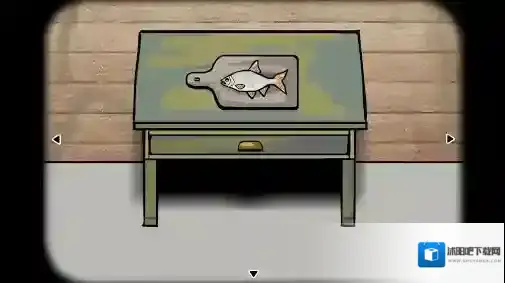 1、木桌视角:拾取桌脚处的(鱼线),倚靠在柜子上的(鱼竿),在抽屉里获得(刀)。