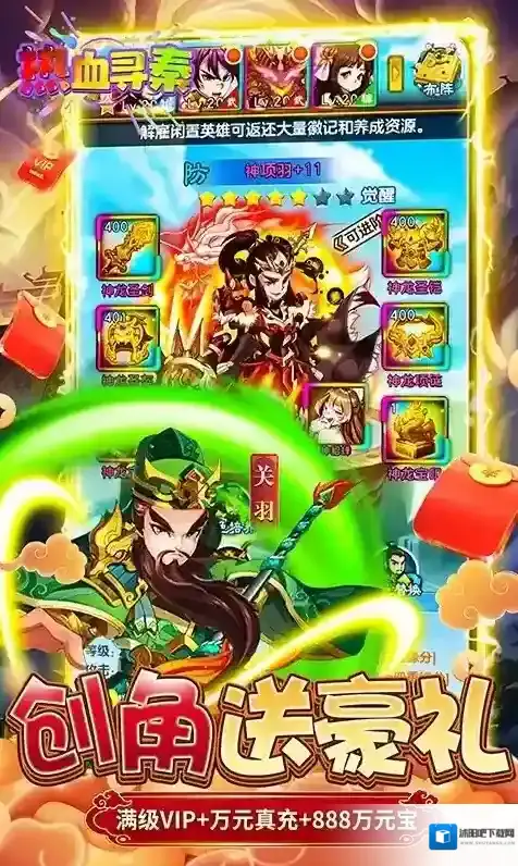 1、创角即送满级VIP、200秦晶、10000元真充卡、8888万金币、888万元宝、5000体力