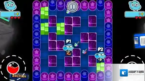 2、进入关卡后玩家滑动左边屏幕可以控制角色移动,角色只会沿着直线前进,右下方是放置水炸弹按钮。