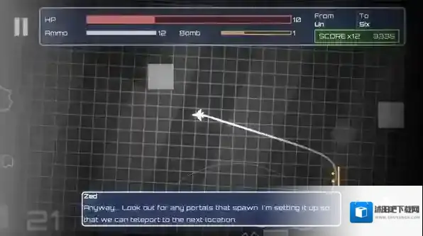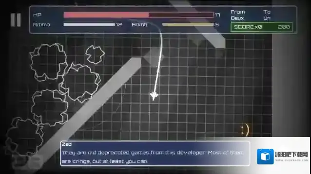 4、正式开始后点击左右屏幕可以控制飞行的方向,同时按住两边的屏幕可以发射子弹摧毁敌人和障碍物。屏幕上方的HP是血量,Ammo是弹药,Bomb是炸弹数量