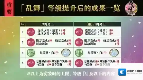 「乱舞」等级与现有的「刀剑」等级不同,是能够让刀剑男士通过「习合」来提升的另外一种等级系统。