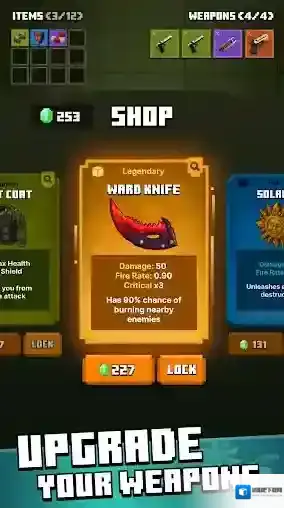 5、当玩家坚持一段时间后所有怪物会全部消灭,此时会进入商店,在商店里玩家可以用拾取的绿色晶石来购买不同的装备和武器。