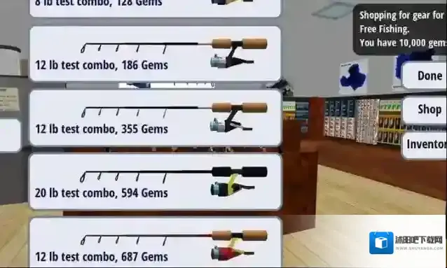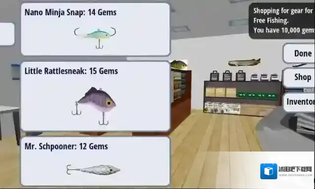 3、选好地点后需要去购买装备,点击shop按钮来购买不同的钓鱼装备。