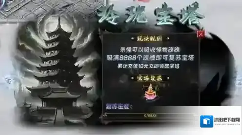 杀怪可以吸收怪物魂魄吸满8888个魂魄即可复苏宝塔,累计充值10元立即领取宝塔。