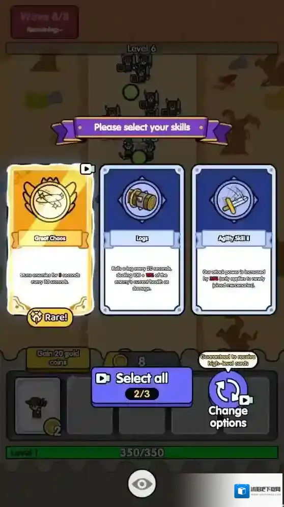 3、召唤不同的小兵需要的金币数量是不一样的,当击败敌人后会获得经验,提升等级后可以选择一个技能来强化小兵。