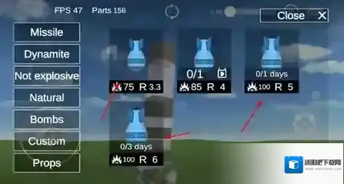 4、打开道具选择界面,挑选适合的爆破类道具,利用其破坏效果来提高建筑的损毁效率,从而积累更多积分。