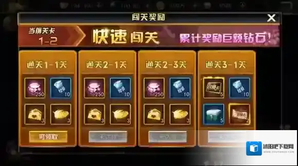 5、冲关豪礼,大量升级材料、钻石直接赠送。