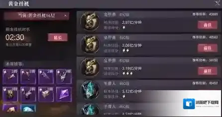 黄金挂机有多个层数可供选择,角色等级越高,可以选择挑战的层数就越高,每层都有不同等级的刷怪区域,怪物等级越高,玩家获取的经验就越多。