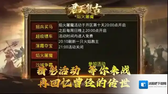 1、落霞夺宝、焰火屠魔、沙城争霸等精彩活动每周定时开放,参与就有机会获得大量金币、装备和技能奖励。