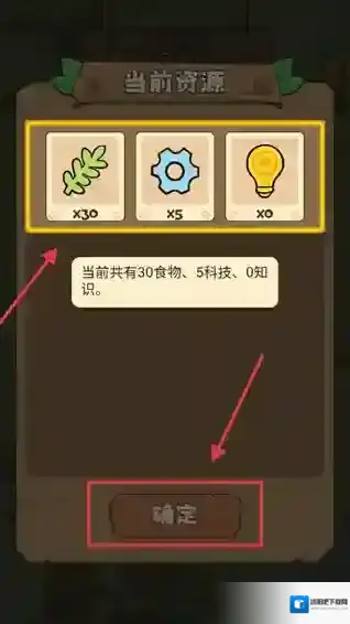 2、查看当前资源【食物】-【30】、【科技】-【5】、【知识】-【0】,点击【确定】按钮,进入文明发展的实际操作阶段。