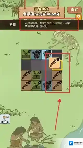 4、科技的合成规则为方块可移动【1】格,有【3】个及以上相邻时可合成获得【科技】资源;移动【树枝】方块,使其与其他树枝相邻凑足数量,即可合成获取资源。